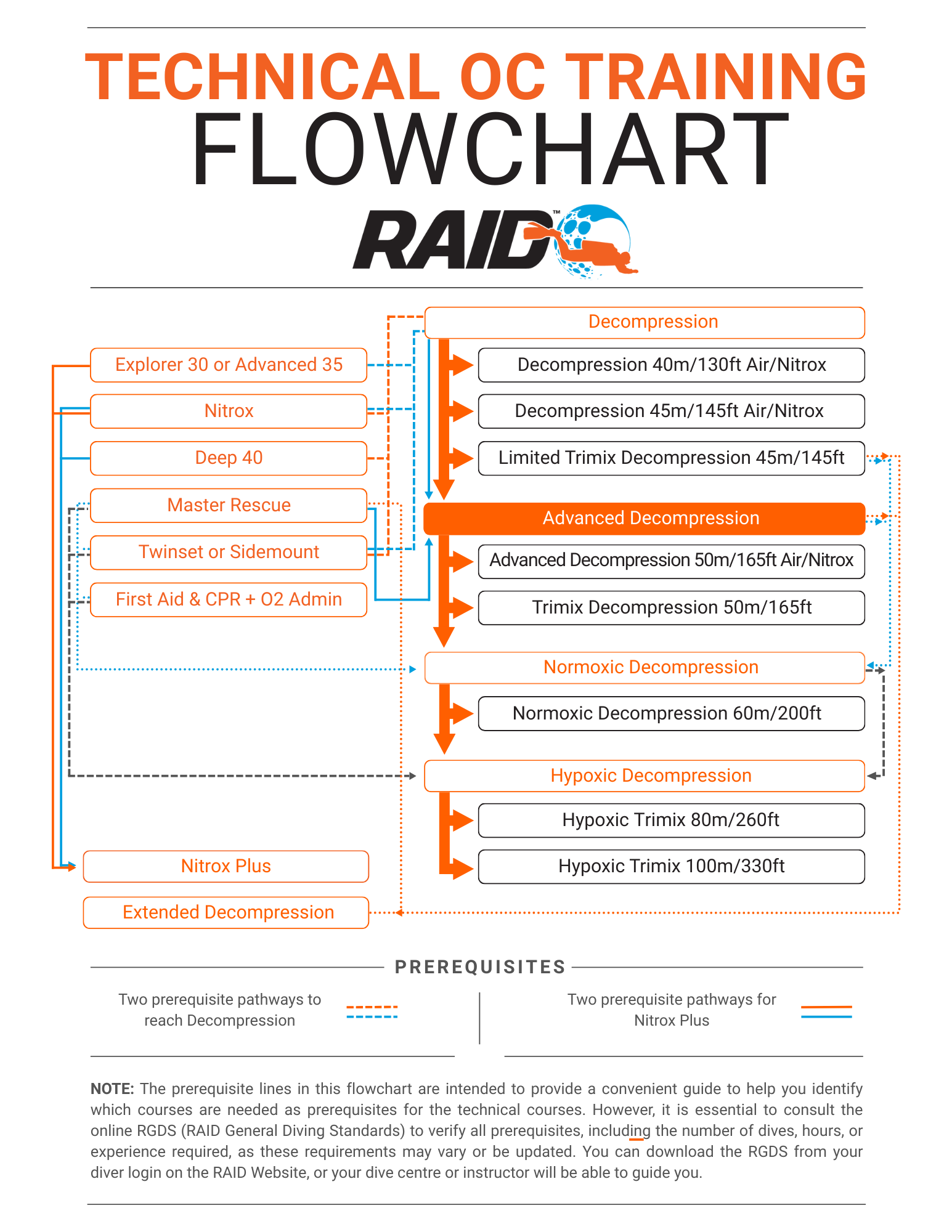 - There are some dive sites a little deeper, in more challenging locations, that are only within reach of those divers who have decided to do the work and broaden the scope of their training and make the most of their opportunities. If that sounds like you, then this is your next step. Advanced Decompression diving with RAID is open to twinset or sidemount divers wanting to plan and execute dives using two different decompression gases to optimize off-gassing during ascent. Certifications for RAID’s Advanced Decompression course are offered in two options: 50 metres air and nitrox; 50 metres air, nitrox, trimix. It is available to open circuit divers in twinset or sidemount configuration.40 metres air and nitrox | 45 metres air, nitrox | 45 metres air, nitrox, trimix.