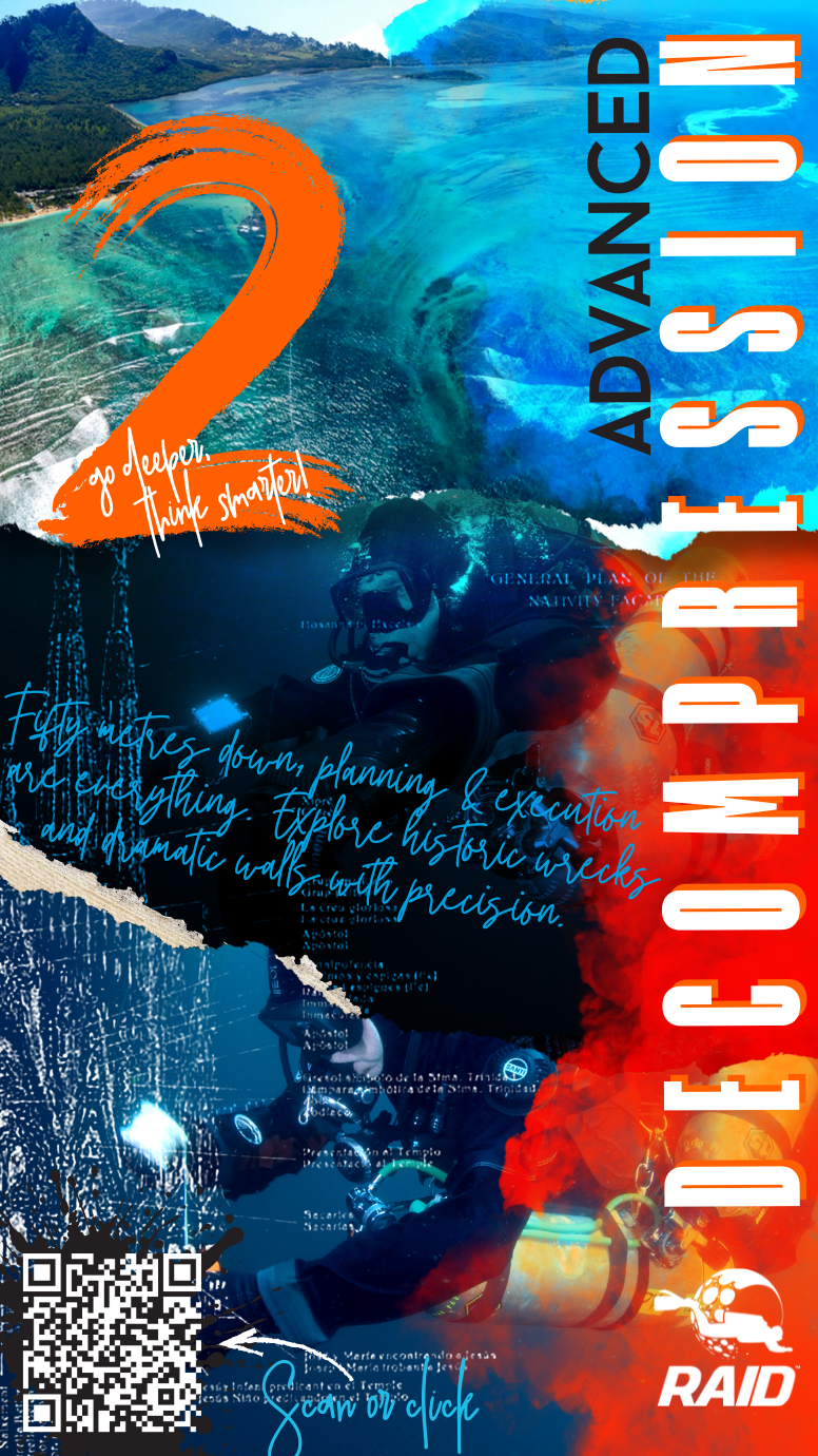 RAID ADVANCED DECOMPRESSION is offered in two options: 50 metres air and nitrox | 50 metres air, nitrox, trimix, and is available to divers in twinset or sidemount configuration.